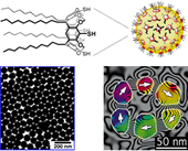 Functional nanomaterials by self-assembly. Top, nanoparticle encapsulated by resorcinarenes; right, 2D array of 87-nm gold particles; left, electron holography image of magnetic nanoring.