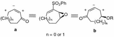 | 204. | Chiral Carbon Catalog 7 Synthesis of Highly Substituted Enantiopure C6 and C7 Enones. Evarts, J,; Torres, E.; Fuchs, P.L. J. Am. Chem. Soc. 2002, 124, 11093-11101. Enantiopure epoxyvinyl sulfones SS-9A, SS-9b produced from Jacobsen epoxidation of 2-phenylsulfonyl 1,3-cyclohexa- and cycloheptadiene, are used as a template for the construction of substituted cycloalkenones and as chiral synthetic equivalents of enones a and b. The addition of carbon nucleophiles to SS-9a, SS-9b is highly yielding and stereospecific. Enantiopure alpha, beta, and gamma-substituted cycloalkenones are easily constructed using a variety of methods . |